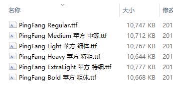 苹方字体6个PingFang Bold 苹方 粗体.ttf+PingFang ExtraLight 苹方 特细.ttf+PingFang Heavy 苹方 特粗.ttf+PingFang Light 苹方 细体.ttf+PingFang Medium 苹方 中等.ttf+PingFang Regular.ttf